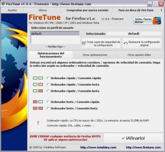 FireTune te permite ajustar algunas opciones ocultas del navegador Mozilla Firefox, con la finalidad de optimizar su rendimiento y acelerar la carga de páginas web y la navegación en la medida de lo posible.